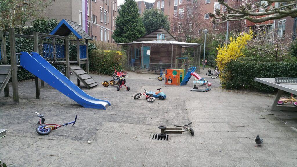 Door de beschutte ligging van de speelplaats is het in het voorjaar al gauw lekker warm: winterjas open en in de zon genieten. In de zomer geven de dakplatanen heerlijke schaduw op de speelplaats. In het najaar worden de dakplatanen door buurtbewoners gesnoeid, zodat er in de herfst weer volop van de zon genoten kan worden. In de winter kunnen de kinderen fijn in de sneeuw spelen. En na een fikse regenbui vinden kinderen het heerlijk om in de plassen te springen, dus laarzen aan!